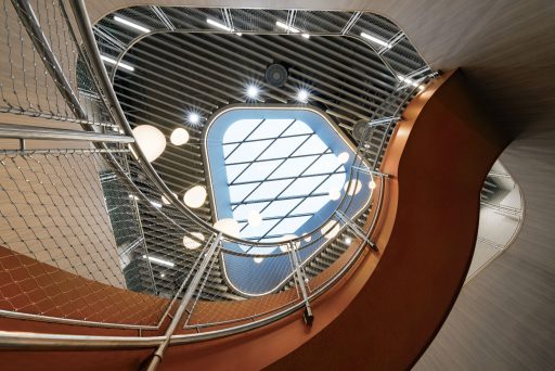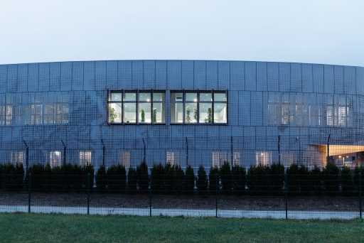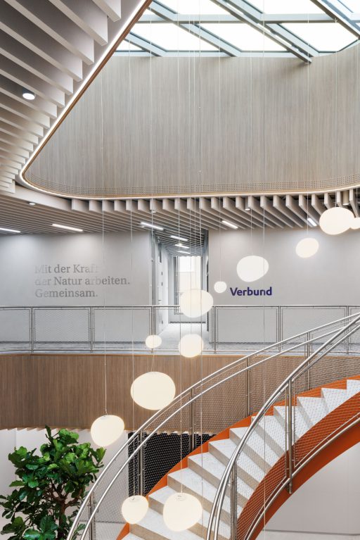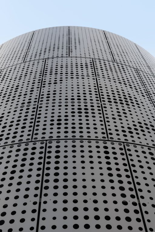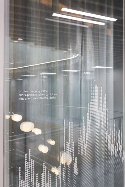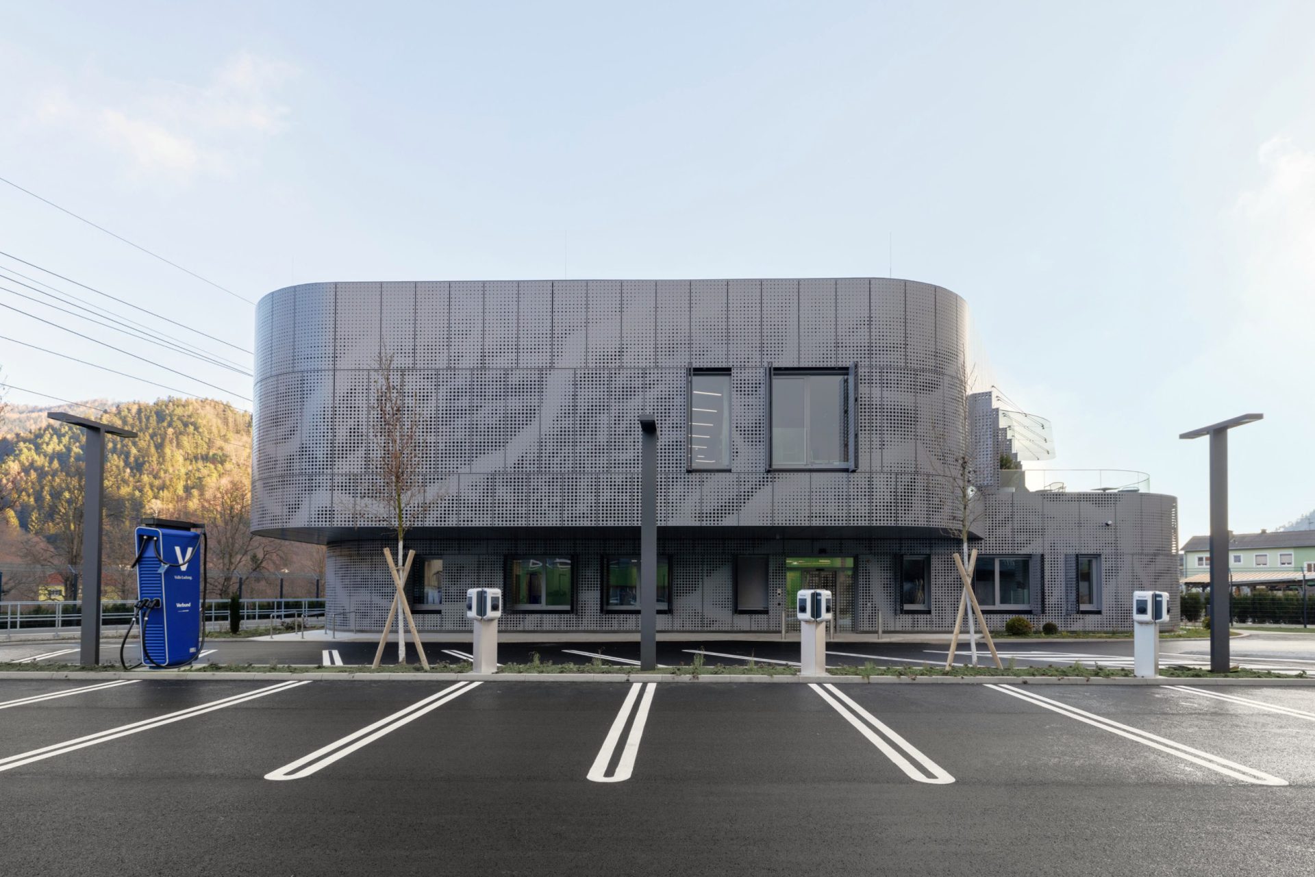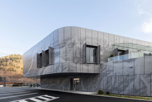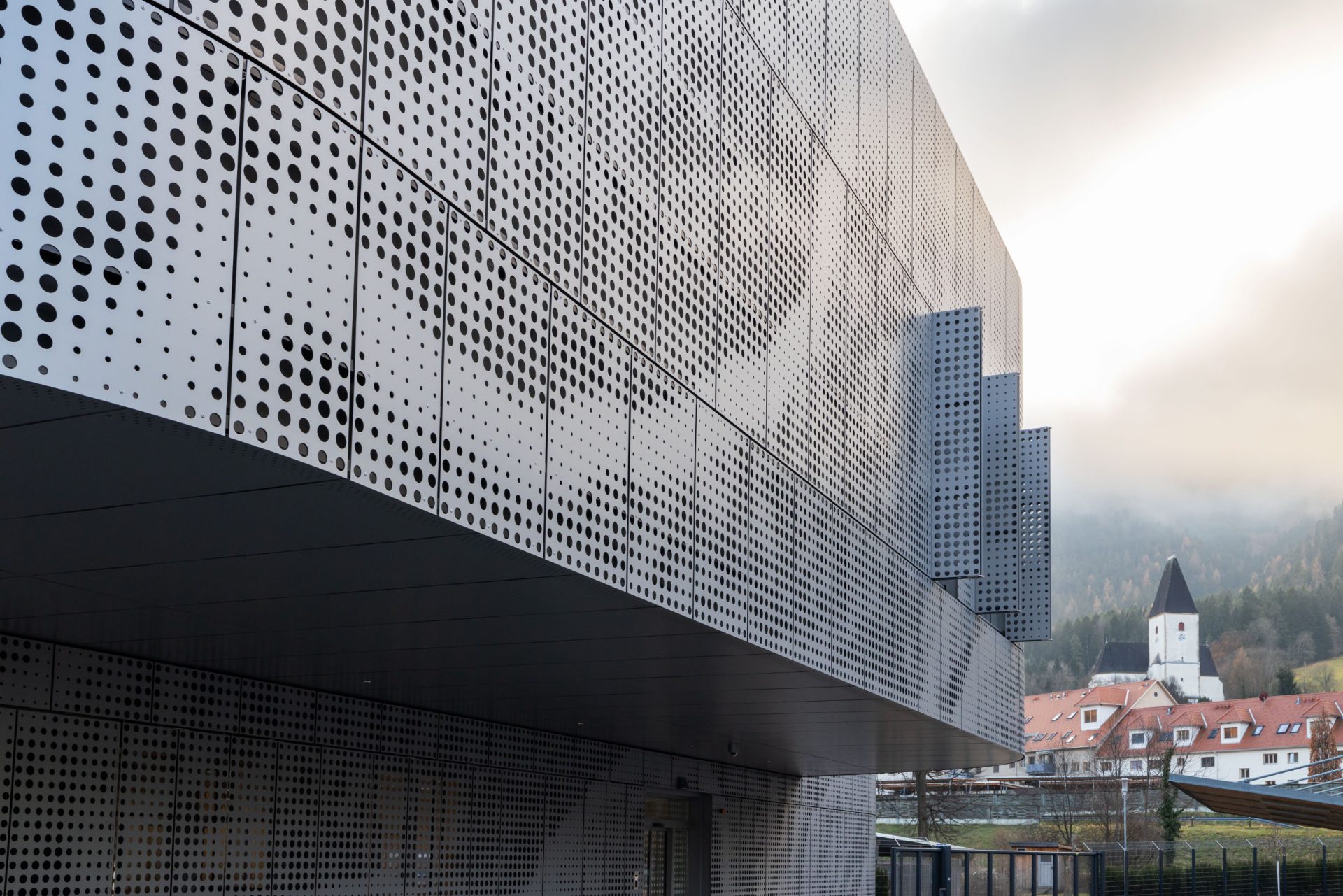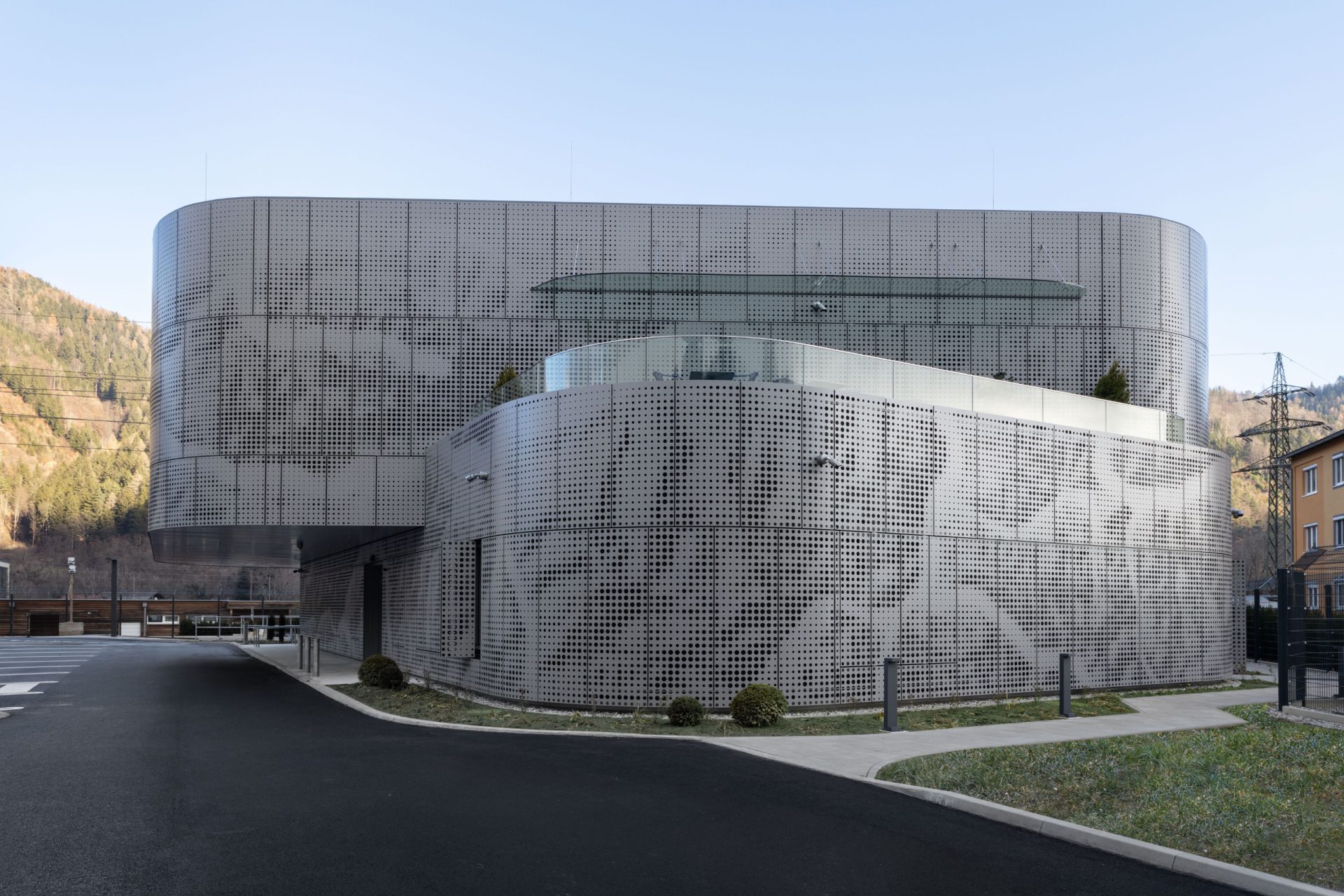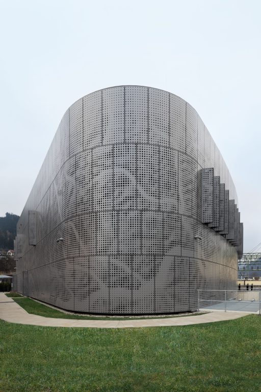 Das dyna­mi­sche Fas­sa­den­sys­tem aus Alu­mi­ni­um ist von den Fluss­land­schaf­ten Öster­reichs inspi­riert. Das para­me­trisch gene­rier­te Loch­bild lei­tet sich von den natür­li­chen Fluss­ver­läu­fen öster­rei­chi­scher Flüs­se ab und wird in eine funk­tio­na­le Gebäu­de­hül­le über­setzt.