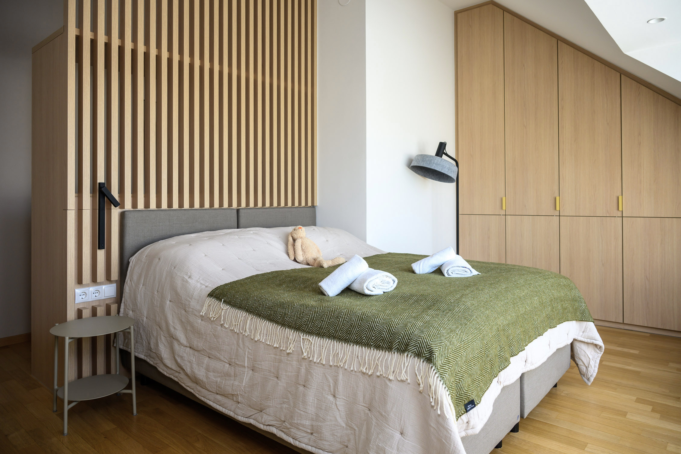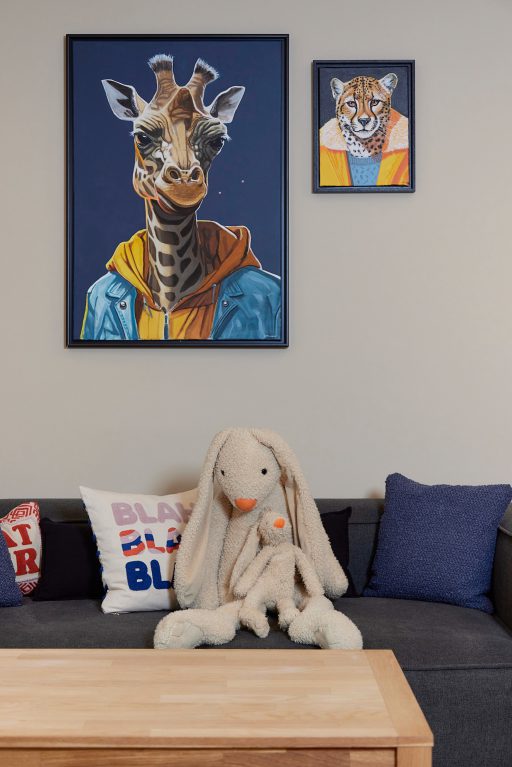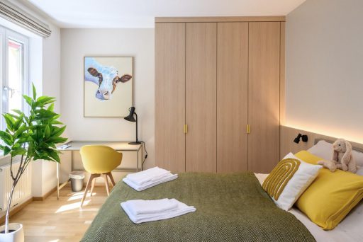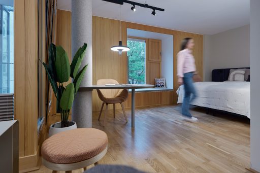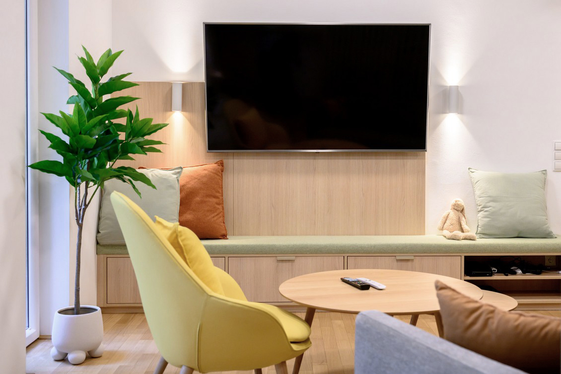 At the Kinderspitalgasse house, 15 family rooms, two common lounges, and the circulation areas were comprehensively renovated. Oak wood defines the interior design concept, creating a natural, calming atmosphere. Green and yellow accent colors add friendly highlights, while a cohesive visual concept featuring animal portraits offers emotional points of connection for the young residents. Spatial quality is enhanced through a combination of flexible, loose furniture and custom-made joinery, giving families greater flexibility in their daily routines. In addition, a modern air-conditioning system ensures contemporary comfort and a consistently pleasant indoor climate.