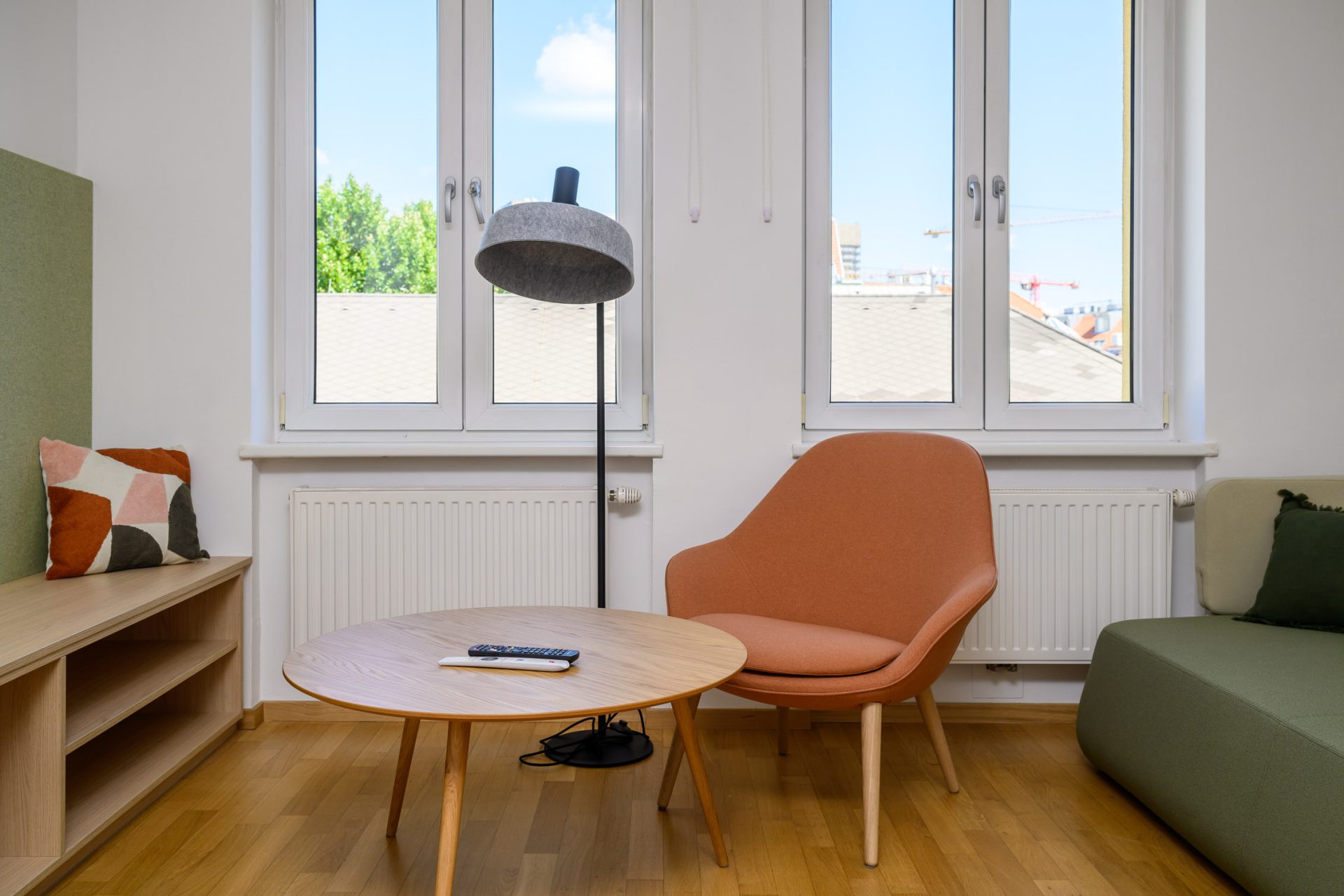 The renovation of the 17 family rooms on Borschkegasse was similarly extensive, while carefully preserving the evolved spatial structure. New custom-made joinery in calm beige tones complements the existing wooden wall paneling, creating bright and functional spaces. The color concept deliberately picks up the distinctive orange from the existing interiors and, with a complementary blue as the new primary color, translates it into a contemporary aesthetic. This combination lends the rooms a sense of calm while also giving them a vibrant identity. The result is a harmonious interplay of old and new that combines everyday practicality with high emotional quality.