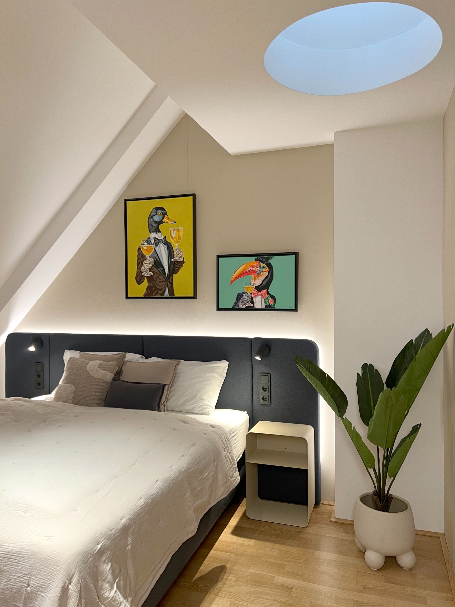 Ähnlich umfangreich war die Renovierung der 17 Familienzimmer in der Borschkegasse, wobei die gewachsene Raumstruktur sensibel bewahrt blieb. Neue Tischlermöbel in ruhigen Beigetönen ergänzen die vorhandenen Wandvertäfelungen aus Holz und schaffen helle, funktionale Räume. Das Farbkonzept greift das markante Orange aus dem Bestand gezielt auf und führt es durch ein komplementäres Blau als neue Hauptfarbe in eine zeitgemäße Ästhetik. Diese Kombination verleiht den Zimmern Ruhe und zugleich eine lebendige Identität. Das Ergebnis ist ein harmonisches Zusammenspiel von Alt und Neu, das Alltagstauglichkeit mit hoher emotionaler Qualität vereint.